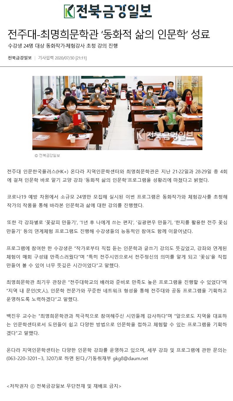 283 기타 전주대-최명희문학관 '동화적 삶의 인문학' 성료 온다라 지역인문학센터 20-08-03 226   200730_전주대-최명희문학관 '동화적 삶의 인문학' 성료_전북금강일보.jpg
