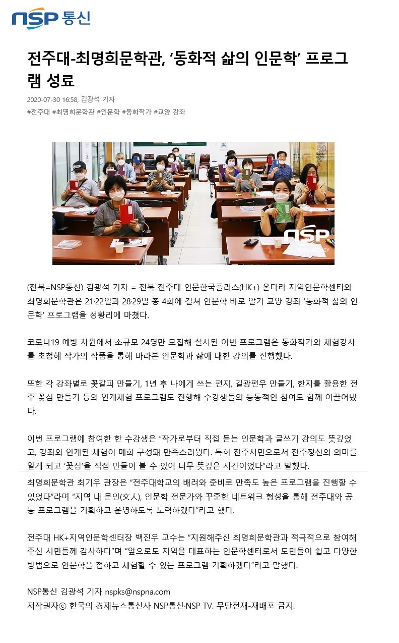 288 기타 전주대-최명희문학관 '동화적 삶의 인문학' 프로그램 성료 온다라 지역인문학센터 20-08-03 206   200730_전주대-최명희문학관 '동화적 삶의 인문학' 프로그램 성료_nsp통신.jpg