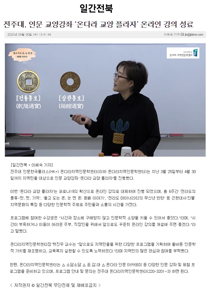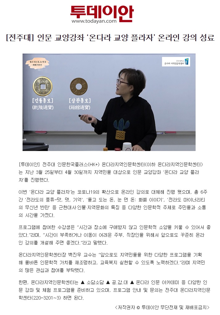 261 기타 전주대, 인문 교양강좌 '온다라 교양 플라자' 온라인 강의 성료 온다라 지역인문학센터 20-05-12 213   200507_전주대, 인문 교양강좌 '온다라 교양 플라자' 온라인 강의 성료_일간전북.jpg