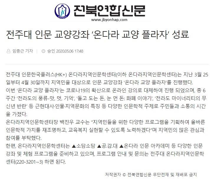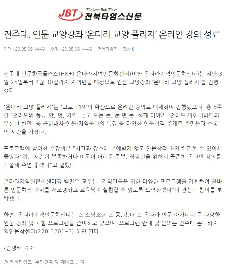 260 기타 전주대, 인문 교양강좌 '온다라 교양 플라자' 온라인 강의 성료 온다라 지역인문학센터 20-05-12 207   200507_전주대, 인문 교양강좌 '온다라 교양 플라자' 온라인 강의 성료_아시아뉴스통신.jpg