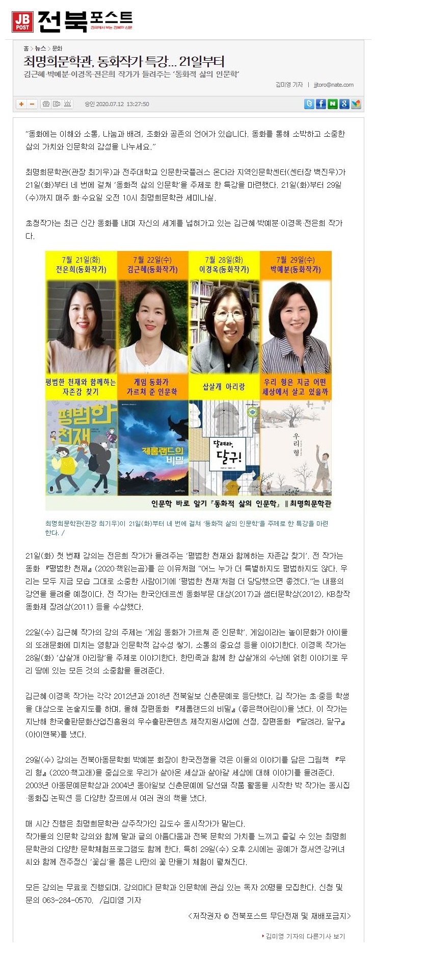 268 기타 최명희문학관, 동화작가 특강... 21일부터 온다라 지역인문학센터 20-07-27 184   200712_최명희문학관, 동화작가 특강... 21일부터_전북포스트.jpg