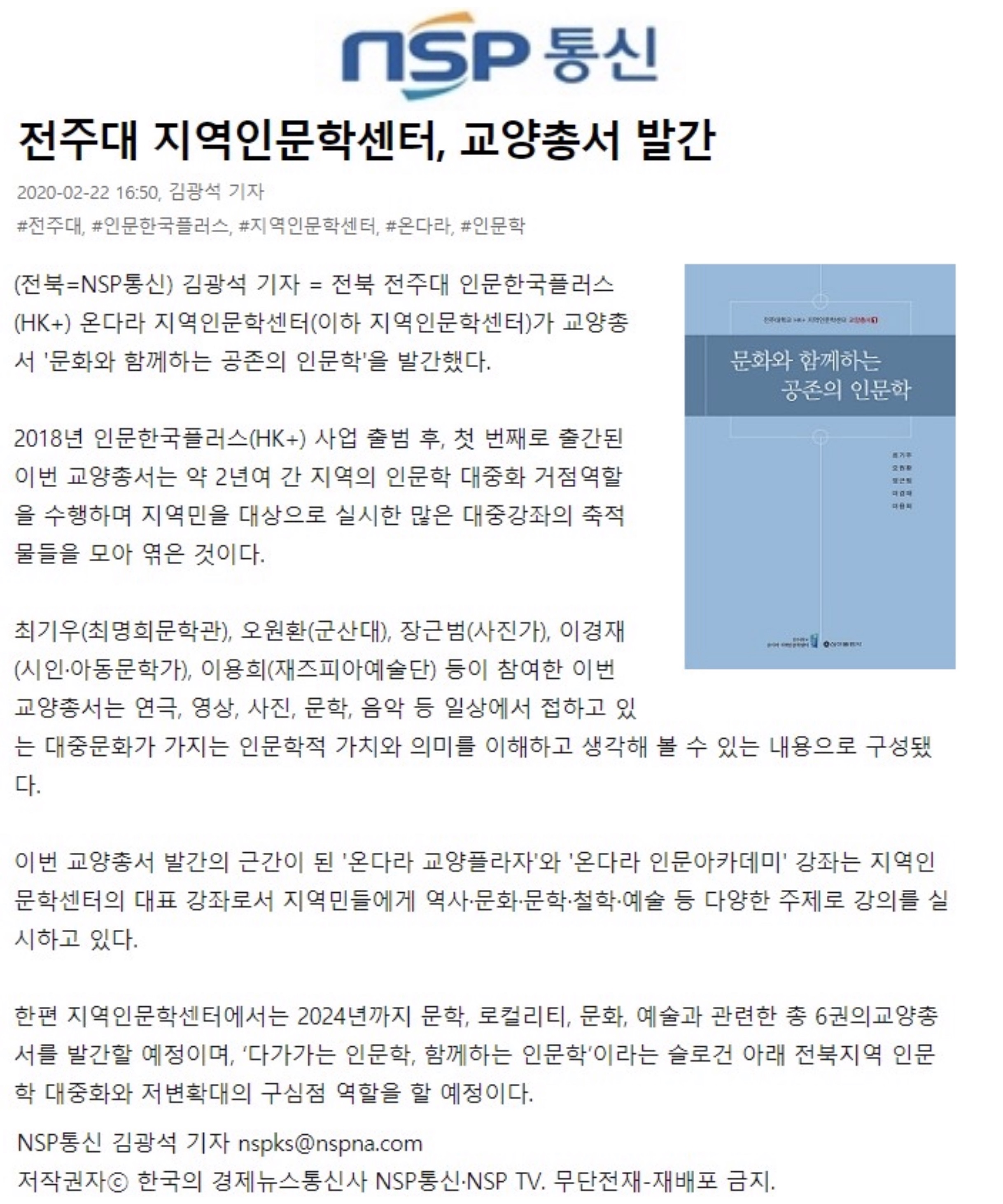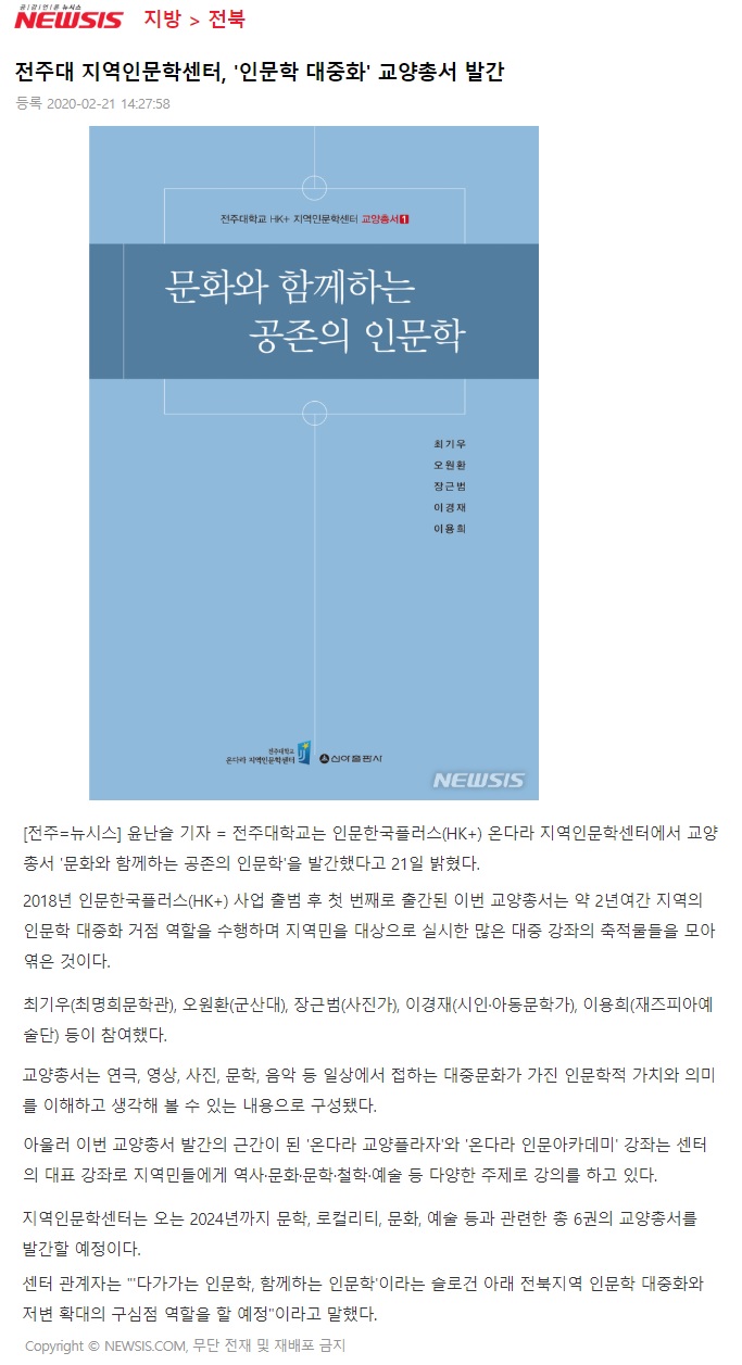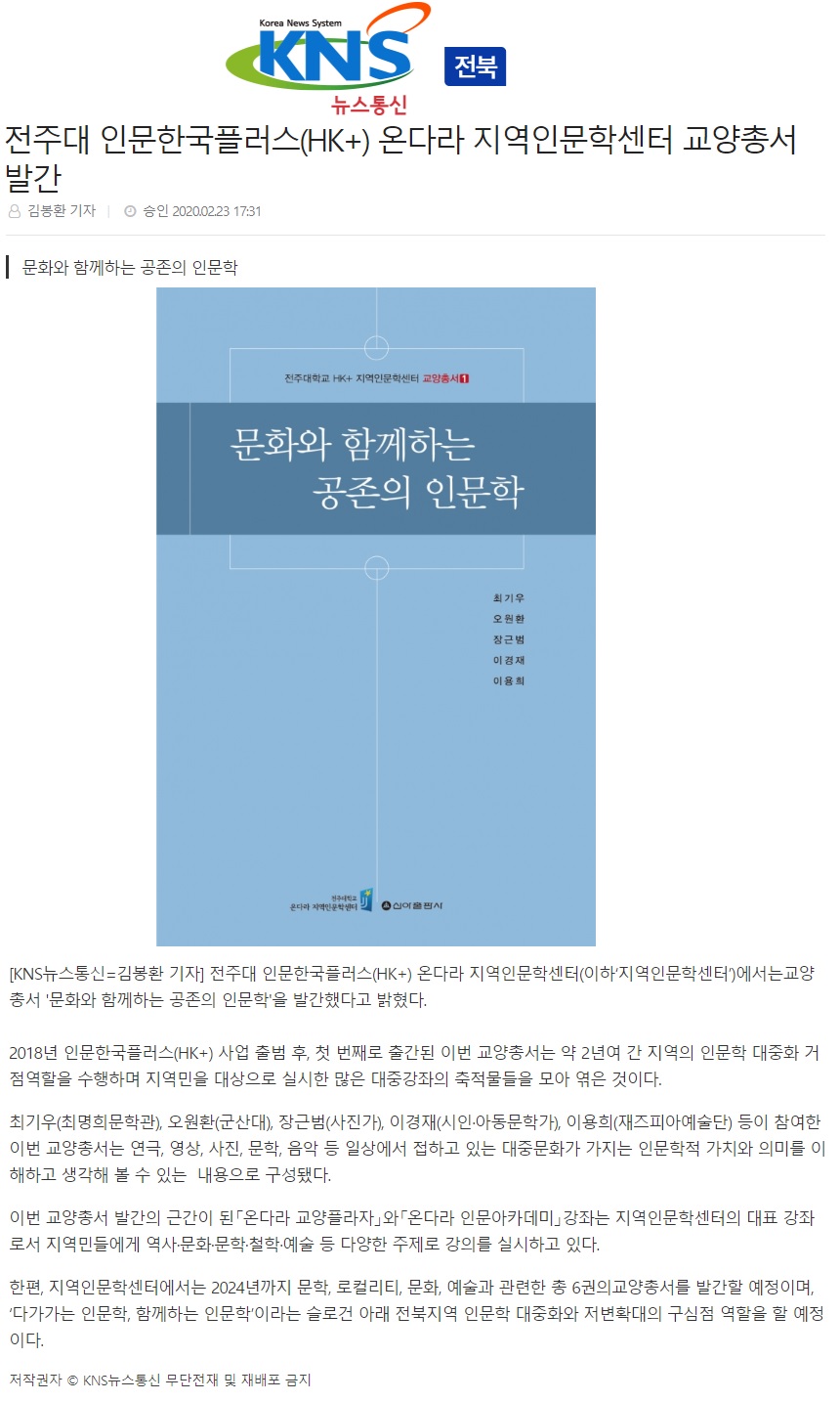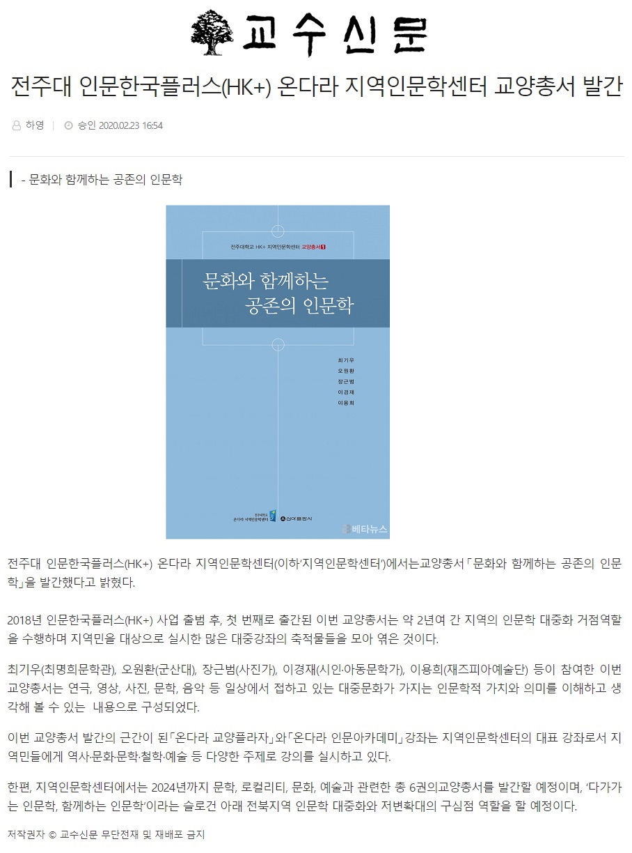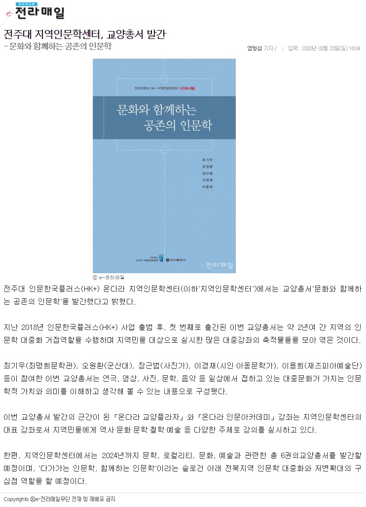 | 230 | 기타 | 전주대 지역인문학센터, '인문학 대중화' 교양총서 발간 | 온다라 지역인문학센터 | 20-02-27 | 230 |