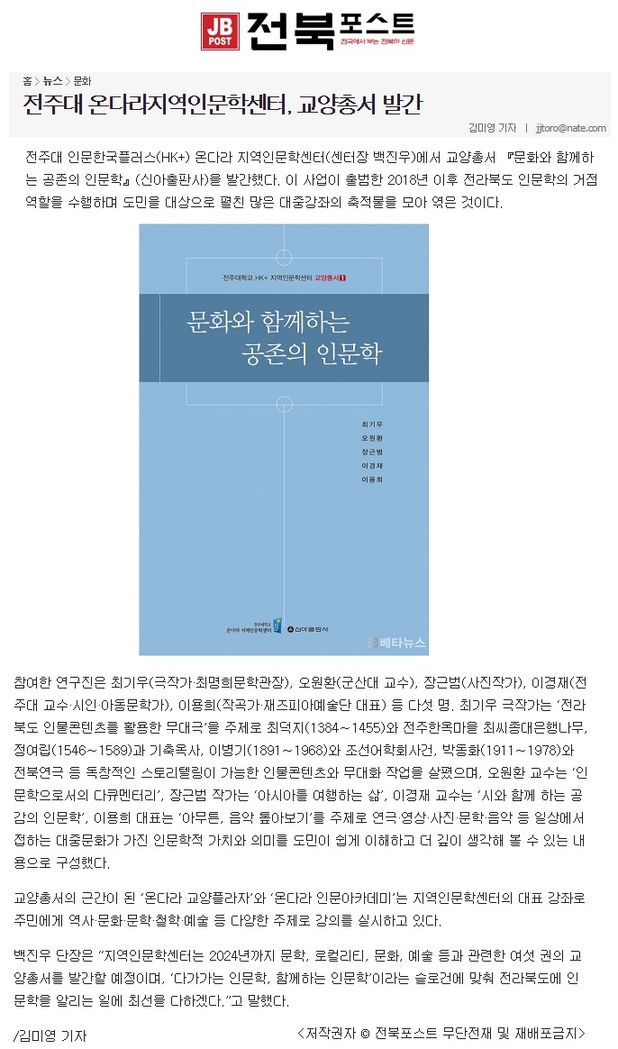 전주대 온다라지역인문학센터, 교양총서 발간