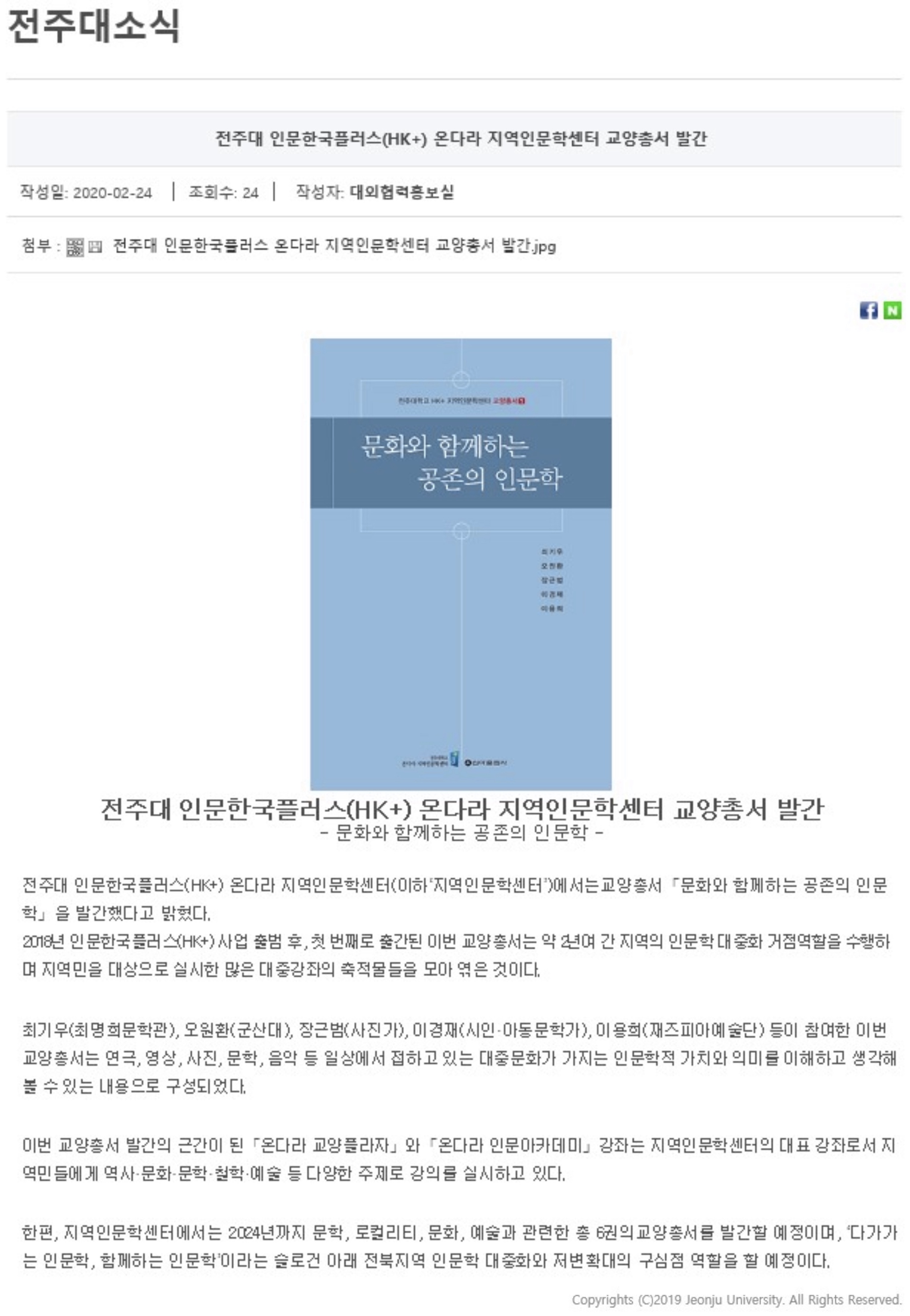 | 235 | 기타 | 전주대 인문한국플러스(HK+) 온다라 지역인문학센터 교양총서 발간 | 온다라 지역인문학센터 | 20-02-27 | 221 |