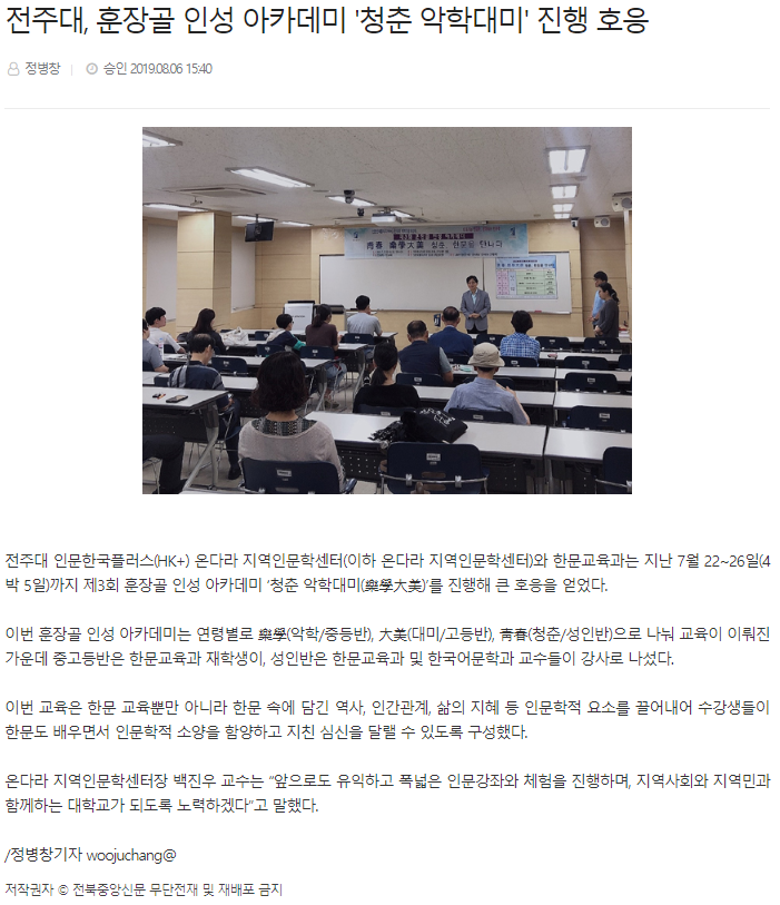| 179 | 기타 | 전주대, 훈장골 인성 아카데미 '청춘 악학대미' 진행 호응 | 온다라 지역인문학센터 | 19-08-20 | 236 |