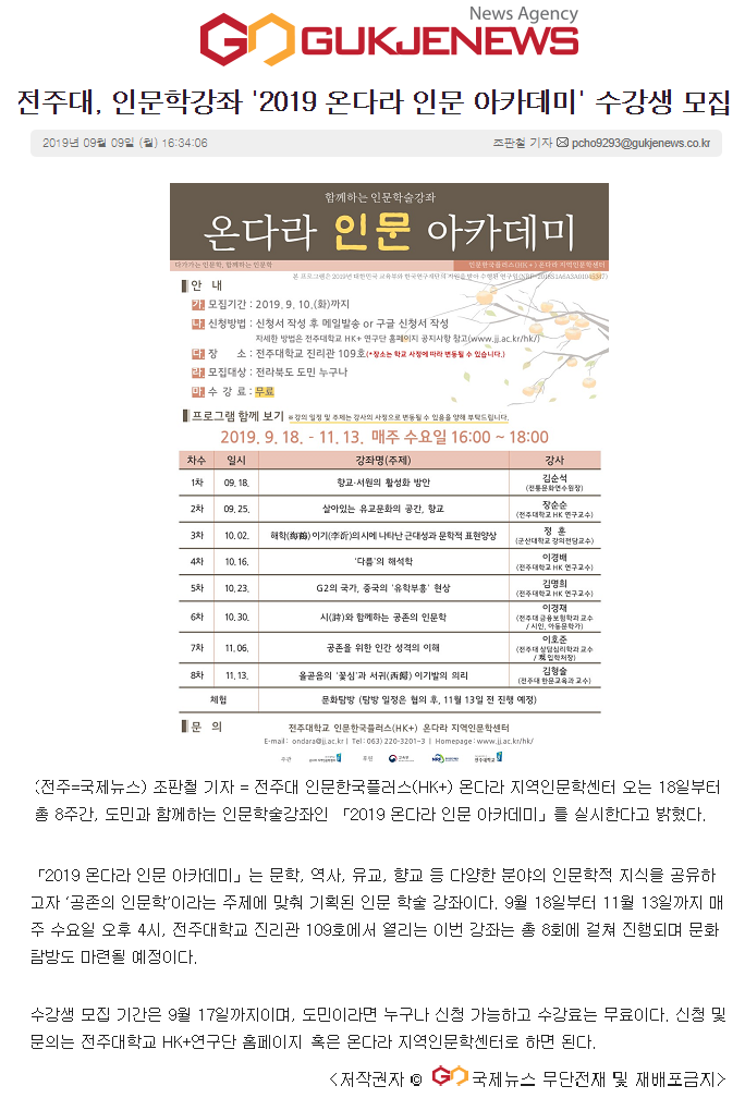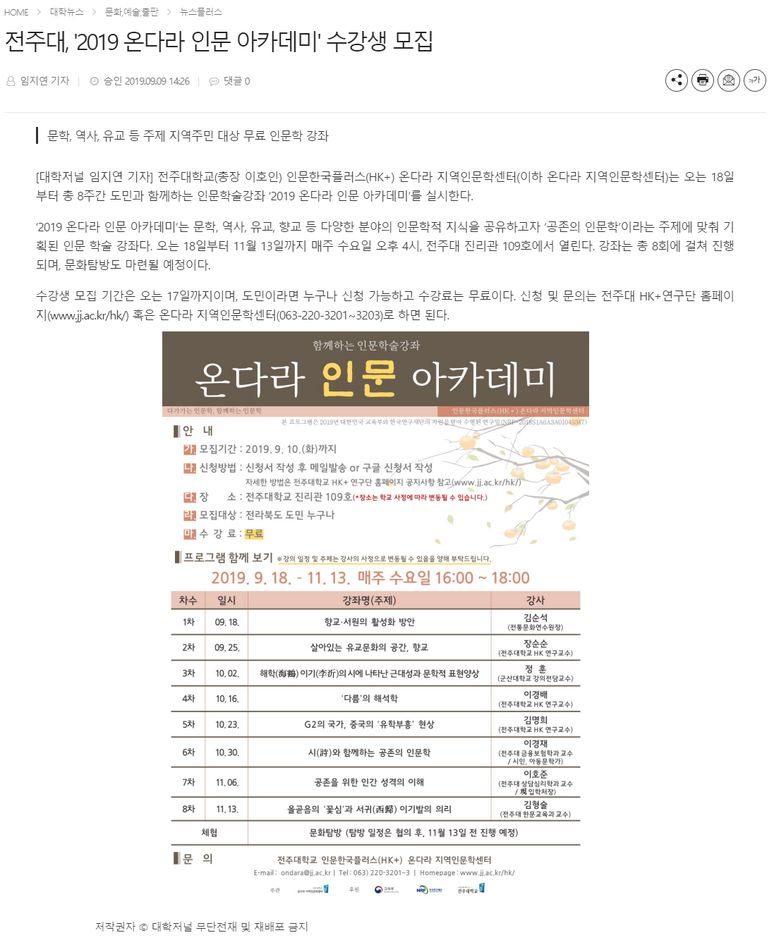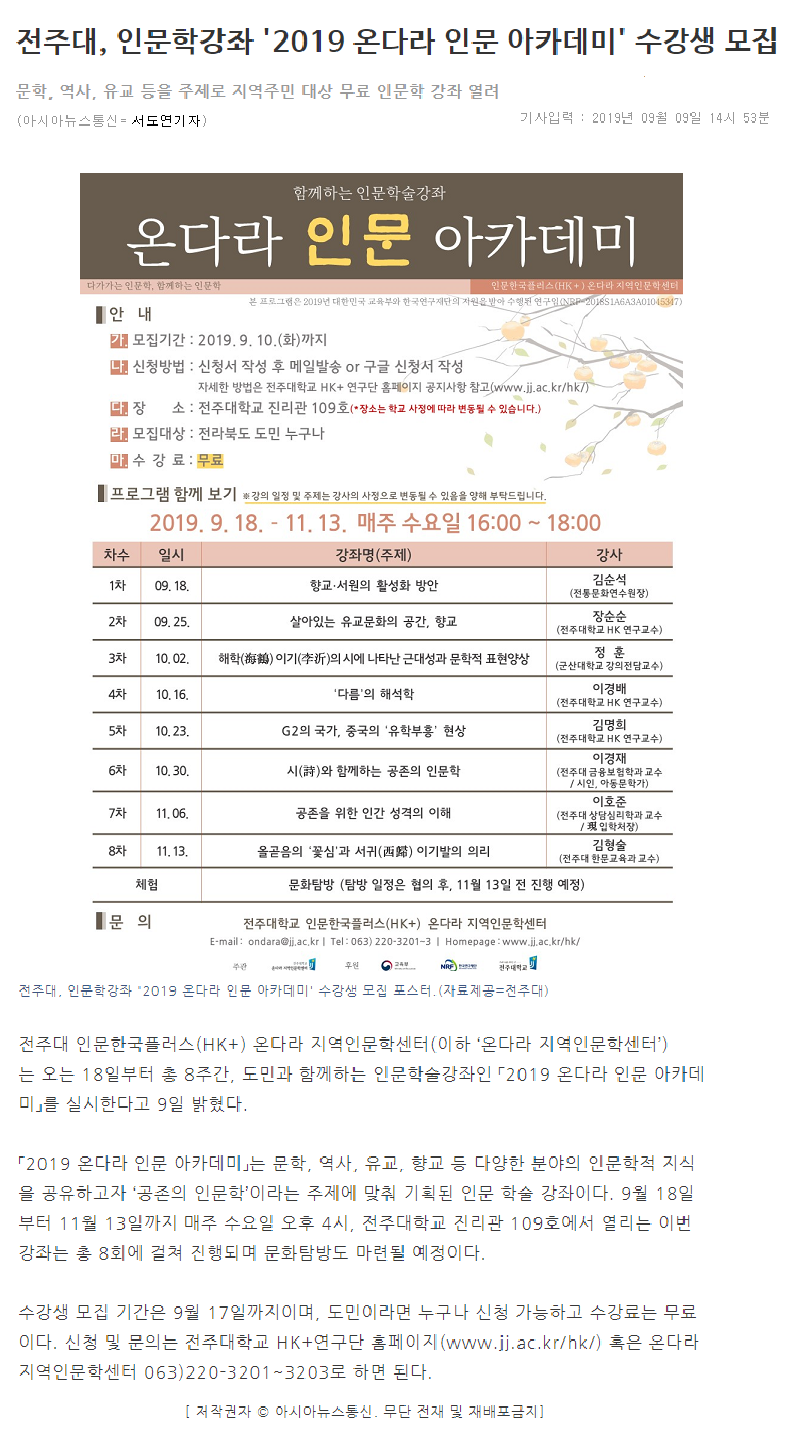 | 183 | 기타 | 전주대, '2019온다라 인문 아카데미' 수강생 모집 | 온다라 지역인문학센터 | 19-09-10 | 238 |