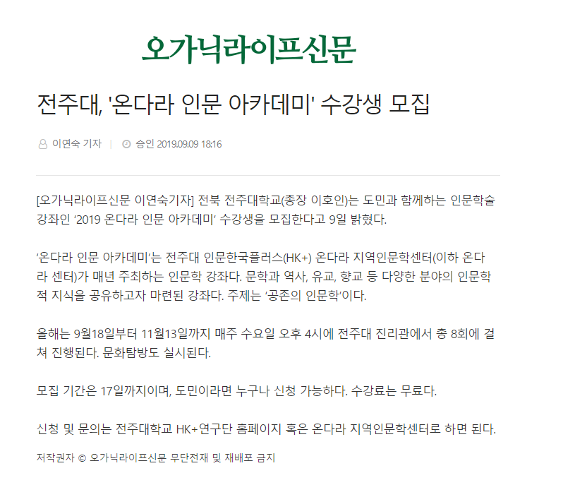 | 187 | 기타 | 인문학강좌 '2019 온다라 인문 아카데미' 수강생 모집 | 온다라 지역인문학센터 | 19-09-11 | 253 |