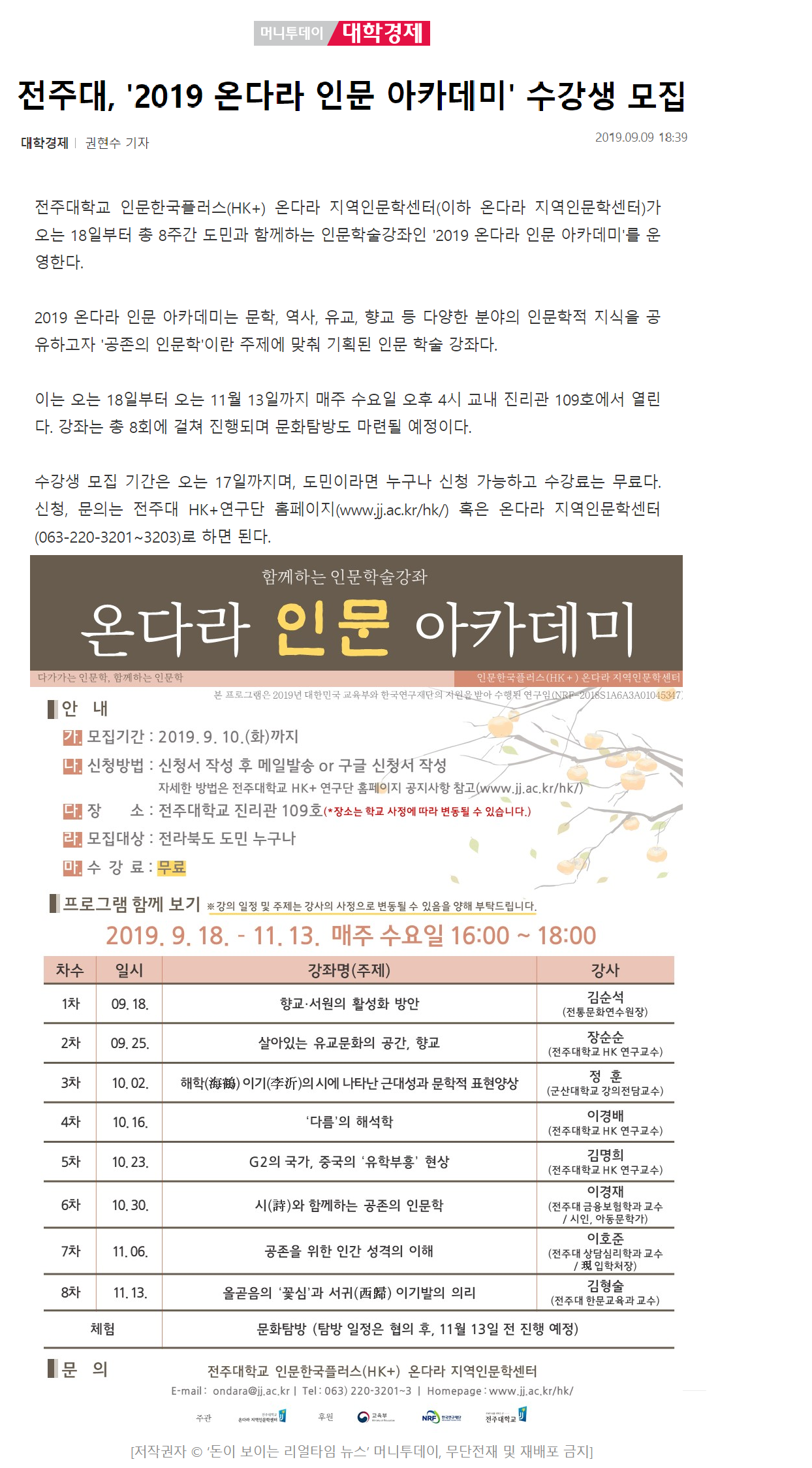 | 186 | 기타 | 전주대, 인문학강좌 '2019 온다라 인문 아카데미' 수강생 모집 | 온다라 지역인문학센터 | 19-09-11 | 248 |
