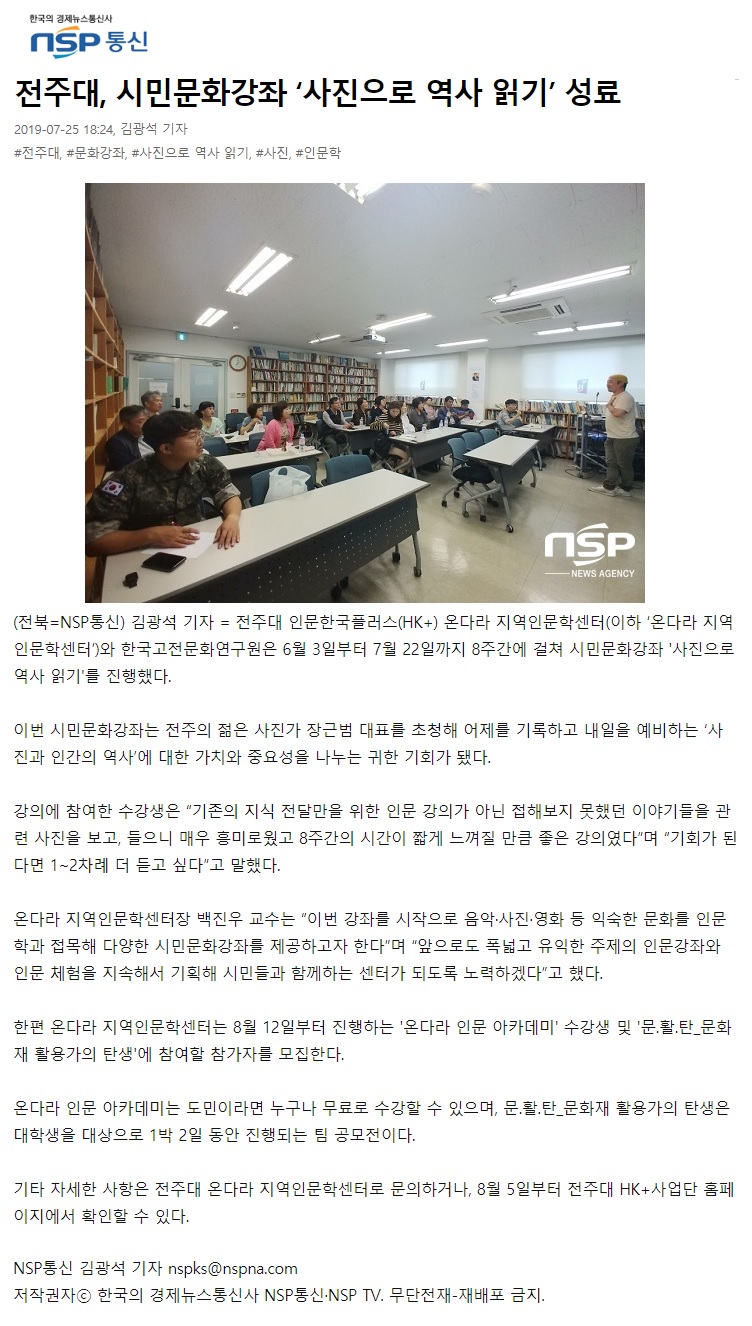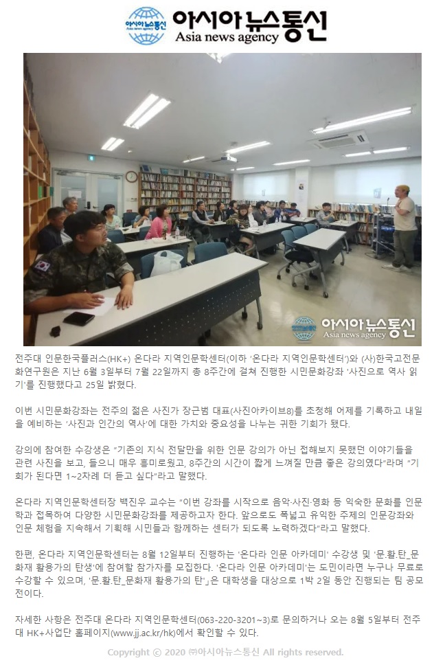 169 기타 전주대, 시민문화강좌 ‘사진으로 역사 읽기’ 성료 온다라 지역인문학센터 19-08-11 243   190725_전주대, 시민문화강좌 ‘사진으로 역사 읽기’ 성료_아시아뉴스통신.jpg