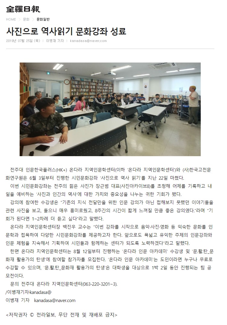 171 기타 사진으로 역사읽기 문화강좌 성료 온다라 지역인문학센터 19-08-11 218   190725_사진으로 역사읽기 문화강좌 성료_전라일보.jpg