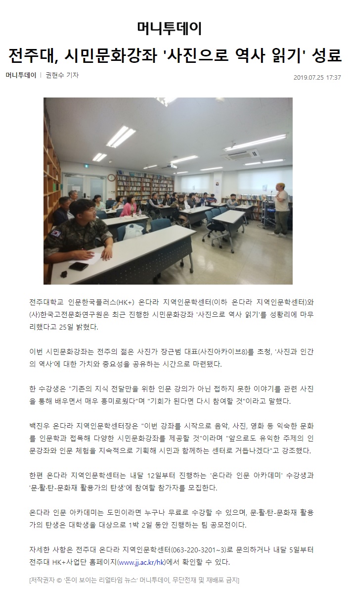 172 기타 전주대, 시민문화강좌 '사진으로 역사 읽기' 성료 온다라 지역인문학센터 19-08-11 270   190725_전주대, 시민문화강좌 ‘사진으로 역사 읽기’ 성료_머니투데이.jpg