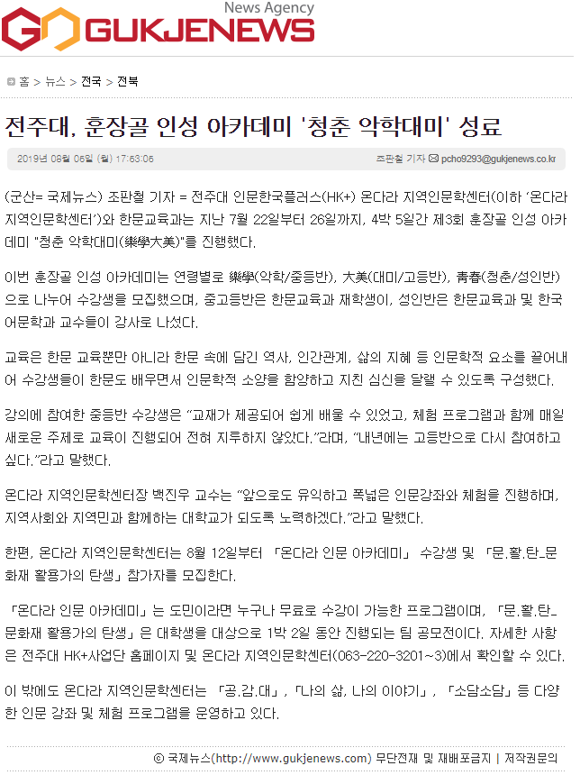 177 기타 전주대, 훈장골 인성 아카데미 '청춘 악학대미' 성료 온다라 지역인문학센터 19-08-20 238   190805_전주대, 훈장골 인성 아카데미 '청춘 악학대미' 성료_국제뉴스.PNG