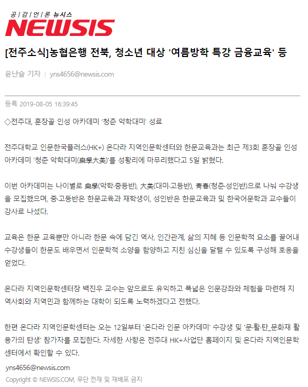 175 기타 [전주소식]농협은행 전북, 청소년 대상 '여름방학 특강 금융교육' 등 온다라 지역인문학센터 19-08-20 242   190805_[전주소식]농협은행 전북, 청소년 대상 '여름방학 특강 금융교육' 등_뉴시스.PNG
