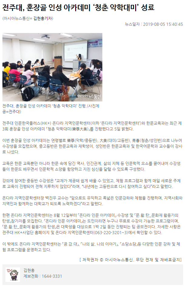 173 기타 전주대, 훈장골 인성 아카데미 ‘청춘 악학대미’ 성료 온다라 지역인문학센터 19-08-20 243   190805_전주대, 훈장골 인성 아카데미 ‘청춘 악학대미’ 성료_아시아뉴스통신.PNG