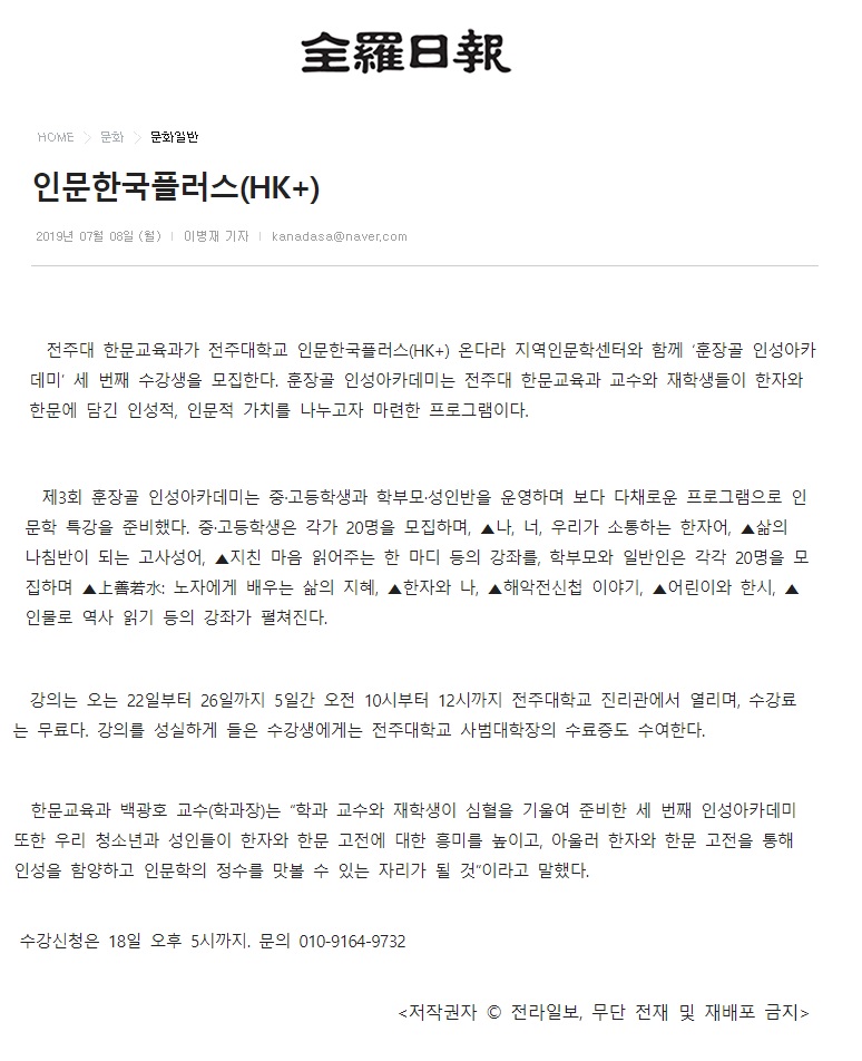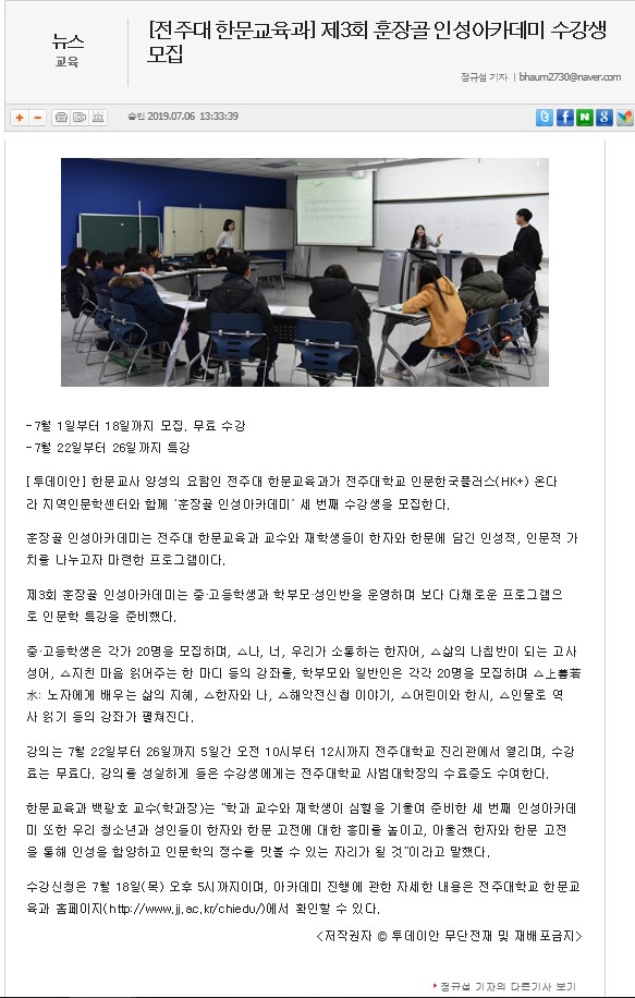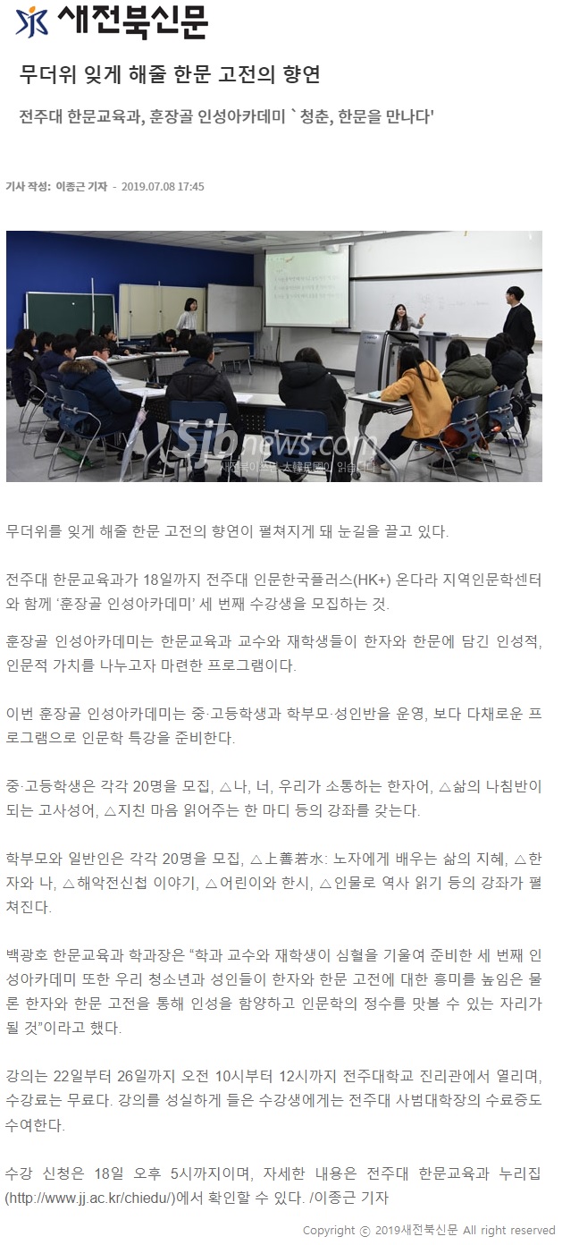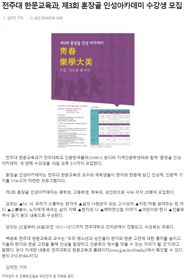 163 기타 전주대 한문교육과, 제3회 훈장골 인성아카데미 수강생 모집 온다라 지역인문학센터 19-08-11 238   190708_전주대 한문교육과, 제3회 훈장골 인성아카데미 수강생 모집_전북도민일보.jpg