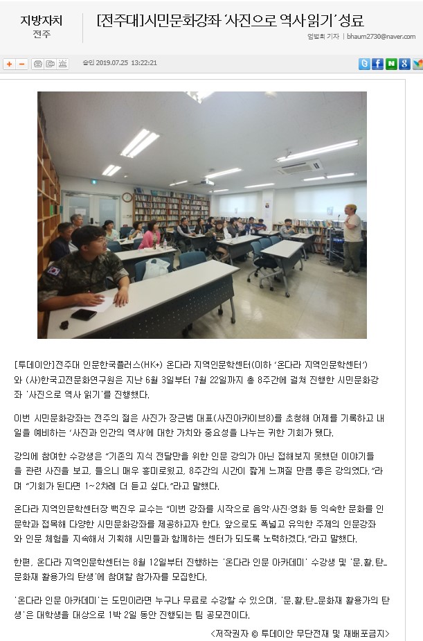 166 기타 [전주대]시민문화강좌 ‘사진으로 역사 읽기’ 성료 온다라 지역인문학센터 19-08-11 231   190725_[전주대]시민문화강좌 ‘사진으로 역사 읽기’ 성료_투데이안.jpg
