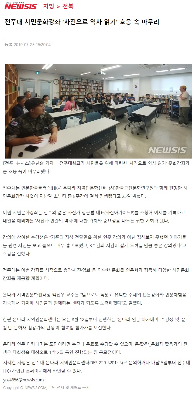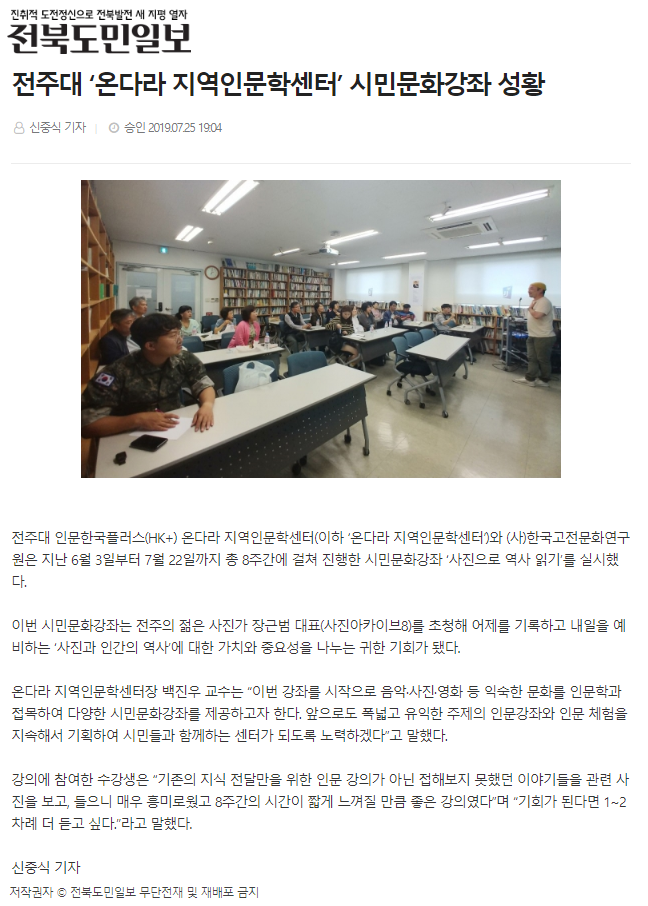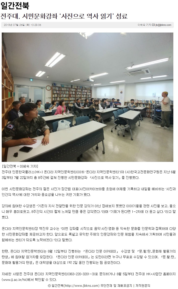 165 기타 전주대, 시민문화강좌 인기 온다라 지역인문학센터 19-08-11 251   190725_전주대, 시민문화강좌 인기_새전북신문.jpg