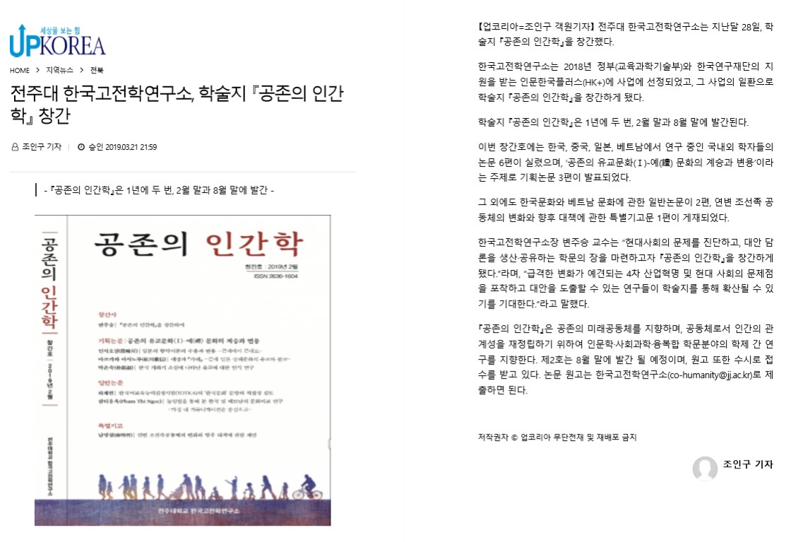 전주대 한국고전학연구소 학술지 '공존의 인간학' 창간