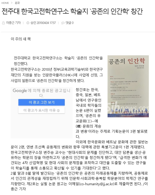 | 149 | 기타 | 전주대 한국고전학연구소, 학술지 『공존의 인간학』 창간 | 온다라 지역인문학센터 | 19-08-11 | 213 |
