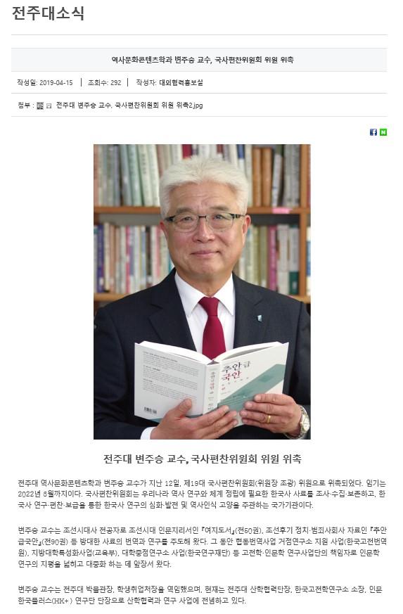 역사문화콘텐츠학과 변주승 교수, 국사편찬위원회 위원 위촉
