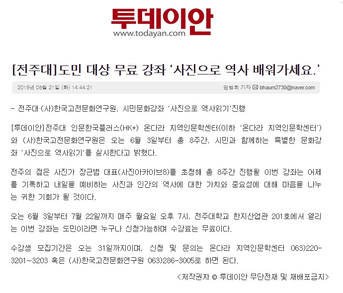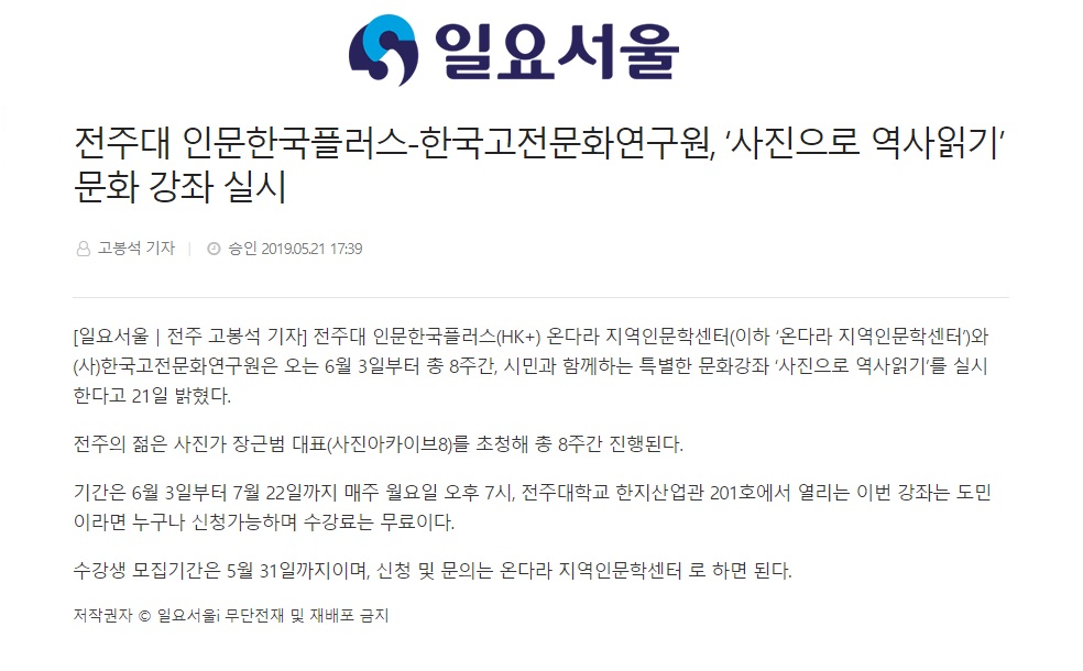 | 156 | 기타 | 전주대, 도민 대상 무료 강좌...“사진으로 역사 배워가세요” | 온다라 지역인문학센터 | 19-08-11 | 219 |