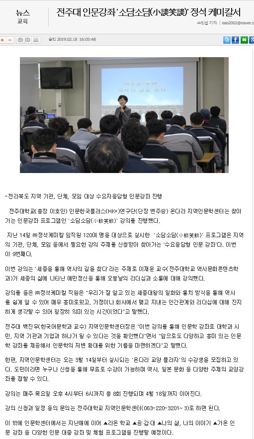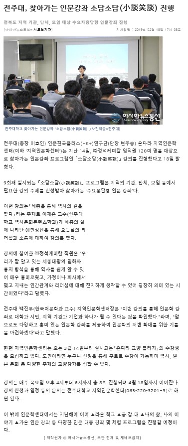 126 기타 전주대, 찾아가는 인문강좌 소담소담(小談笑談) 진행 온다라 지역인문학센터 19-08-11 216   190218_전주대, 찾아가는 인문강좌 소담소담(小談笑談) 진행_아시아뉴스통신.jpg