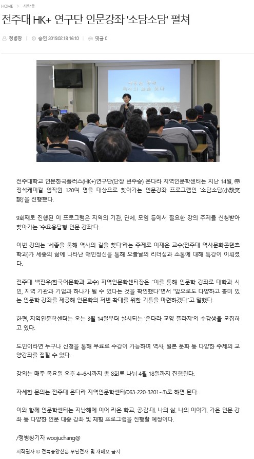 124 기타 전주대 HK+ 연구단 인문강좌 '소담소담' 펼쳐 온다라 지역인문학센터 19-08-11 231   190218_전주대 HK+ 연구단 인문강좌 '소담소담' 펼쳐_전북중앙신문.jpg