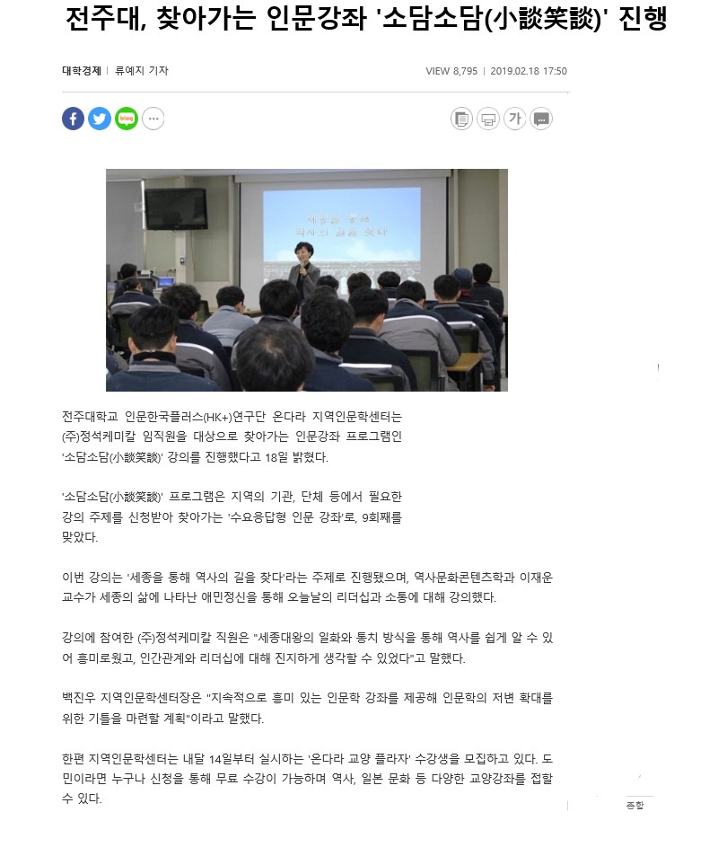 123 기타 전주대 인문강좌 '소담소담(小談笑談)' 정석 케미칼서 온다라 지역인문학센터 19-08-11 221   190218_전주대 인문강좌 '소담소담(小談笑談)' 정석 케미칼서_투데이안.jpg