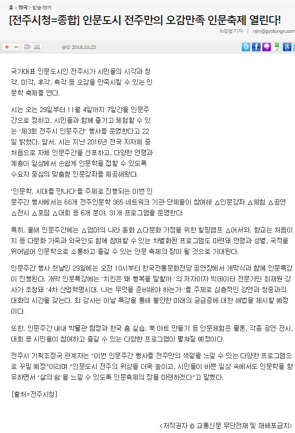 | 80 | 기타 | [전주시청=종합] 인문도시 전주만의 오감만족 인문축제 열린다! | 온다라 지역인문학센터 | 19-08-08 | 230 |