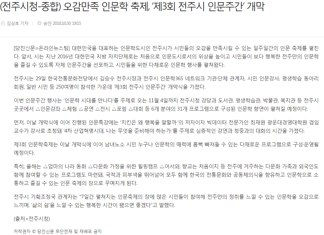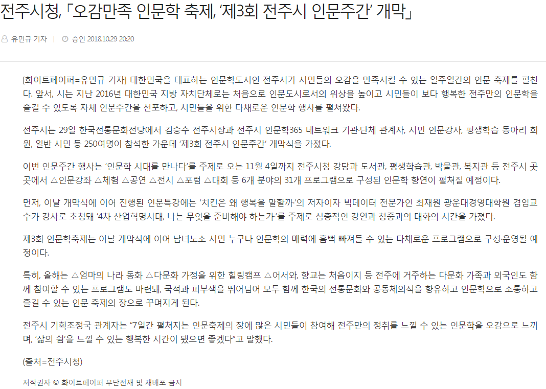 전주시청, 「오감만족 인문학 축제, ‘제3회 전주시 인문주간’ 개막」