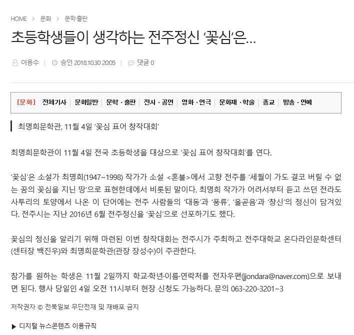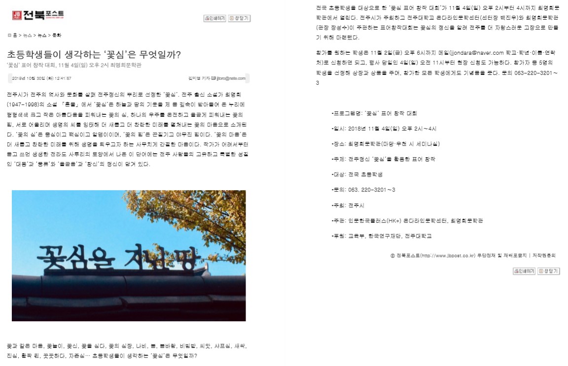 | 86 | 기타 | ‘꽃심 표어 창작대회’ 전국 초등생 대상 개최 | 온다라 지역인문학센터 | 19-08-08 | 227 |