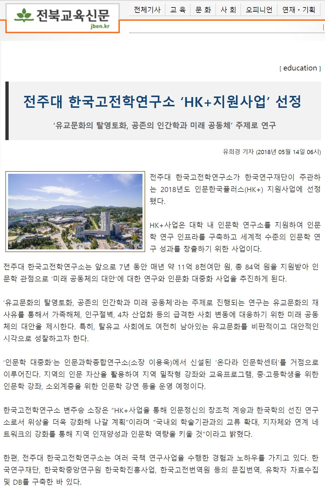 전주대 전북권 최고의 인문학 연구소로 우뚝! 7년간 84억 지원