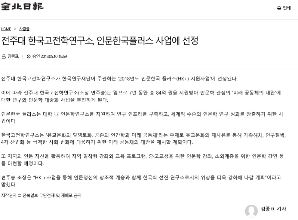 전주대 한국고전학연구소 인문한국플러스 지원사업 선정